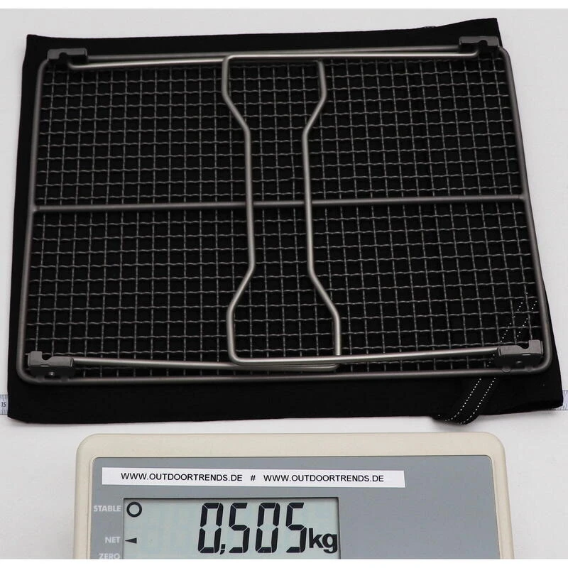 Grille pliante en titane légère, compacte et robuste avec des pieds en acier inoxydable amovibles. En décrochant les pieds, la grille peut également être transformée en une simple grille légère.